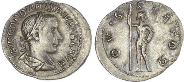 Gordian III (AD 238-244) AR Denarius, mint of Rome, AD 241-243, 2.63g. IMP GORDIANVS PIVS FEL AVG, laureate, draped and cuirassed bust of Gordian III facing right. Rev. IOVI – STATORI, Jupiter standing right, holding sceptre and thunderbolt. (RIC 112). Good Very Fine or better.