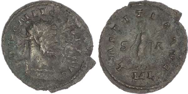 Allectus (AD 293-296) AE Antoninianus, mint of London, 3.76g. IMP C ALLECTVS P F AVG, radiate and cuirassed bust of Allectus facing right. Rev. LAETITIA AVG, S – A, Laetitia standing left, holding wreath and anchor, ML in exergue. (RIC 22). Fine.