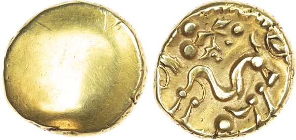 Imported Coinage, Ambiani (c. 58-55 BC) AV Stater, ‘Gallo-Belgic E’, Gallic Wars issue, 6.17g. Blank mound. Rev. Stylised