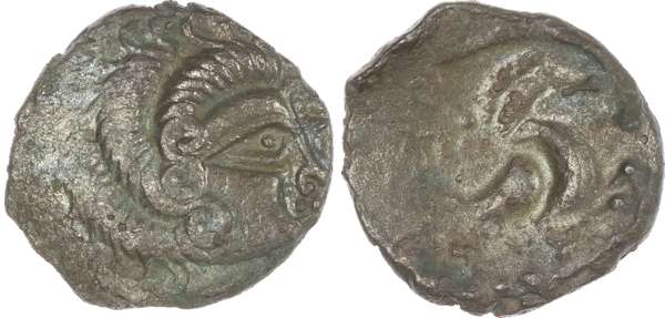 North West Gaul, Coriosolites (c. 100-50 BC) BI Stater, 5.74g. Stylised male head right, hair of large spiral curls. Rev.