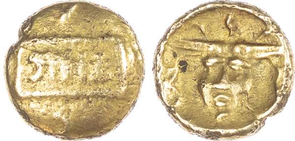 Atrebates & Regini, Tincommius (c. 30 BC – AD 10) AV ¼ Stater, ‘Medusa’ type, 1.00g. TINC on tablet. Rev. Facing winged