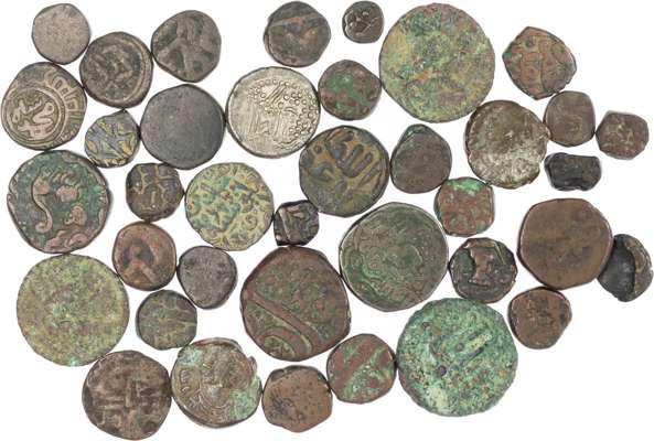 Miscellaneous Kushan and Indian Coins (38). Various issuing authorities. 36 bronze coins and 2 silver/ billon. Varying grades. Lot sold as seen, no returns.