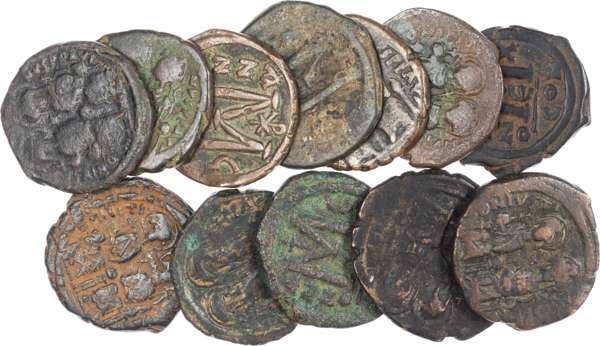Justin II (AD 565‑578) AE Folles (12), mint of Constantinople. Nimbate figures of Justin II and Sophia seated facing. Rev. Large M flanked by legend. (Variations of Sear 360 and 43a). Varying grades. Lot sold as seen, no returns.