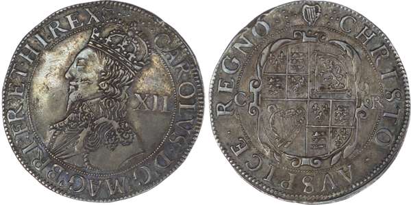 Charles I (1625 - 1649), ‘Fine Work’ Shilling, mm. harp, 1632 – 1633, Group 'D', Obverse Crowned bust of Charles left with lace collar, denomination behind 'XII'. 'CAROLVS D'G' MAG' BRI' FR' ET HI' REX'. Rev. Crowned and garnished oval Royal Arms dividing crowned 'CR', 'CHRISTO AVSPICE REGNO' (I reign under the auspice of Christ). 31mm, 6.04g, (S 2789 var; Sharp D 2). Extremely fine, well struck with underlying lustre.