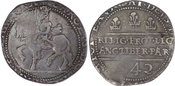 Charles I (1625-49), Halfcrown, 1642, Shrewsbury mint, crowned armoured King on horseback left with upright sword and flowing sash, groundline, no plume in field, legend and beaded borders surrounding, initial mark Shrewsbury plume on obverse only, CAROLVS DG MAG BRIT FR ET HIB REX. Rev, declaration in two lines, RELIG: PROT: LEG / ANGL: LIBER: PAR, three Shrewsbury plumes above, date below, legend reads EXVRGAT DEVS DISSIPENTVR INIMICI, 12.50g (S.2934; N.2378; Brooker 825; Morrison F4 dies). Toned, pleasing detail, a knot of distortion in front of King, legends legible. Rev, precise rendition of the declaration with the three Shrewsbury Plumes all visible, some weakness in the initial date numerals. Bold fine for issue, slightly short of flan, rare.