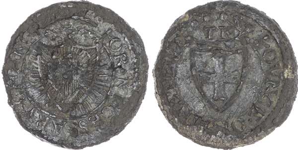 1654 Commonwealth of England. Pattern Farthing in Pewter. BMC 373. Circulated for only a fortnight in April 1654 before being officially withdrawn. Shield bearing cross moline, wreath of roses, TK above. Shield with Irish harp with sun in centre, rays extending. Plain edge. Issued 1654. ¼ OUNCE OF FINE PEWTR FOR NECESSARY CHANGE. Very fine for issue, some blistering on edge. Very rare.