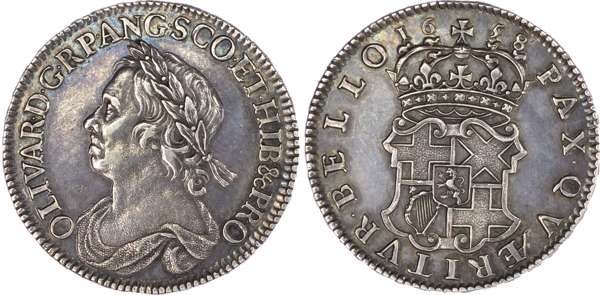 Oliver Cromwell (1656-58), Halfcrown, 1658, laureate and draped bust left, toothed outer border both sides, legend