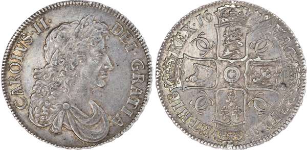Charles II (1660-85), Crown, 1676, third bust right, toothed border both sides, legend surrounding, CAROLVS II DEI GRATIA.