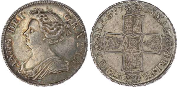 Anne (1702-14), Halfcrown, 1708, second draped bust facing left, legend reads ANNA DEI GRATIA, toothed border both sides. Rev, inverted die axis, post-union crowned cruciform shields, seven strings to Irish harp, plain in angles, garter star at centre, date either side of top crown, legend reads MAG BRI FR ET HIB REG., edge inscription +.DECVS.ET. TVTAMEN. .ANNO. REGNI. SEPTIMO (S.3604; Bull.1366; ESC 577; MCE.940). Olive blue tone accentuated by original mint gold blossom across the surfaces. Portrait well struck up, some faint haymarking, the reverse well defined with few carbon streaks both sides. Extremely fine.