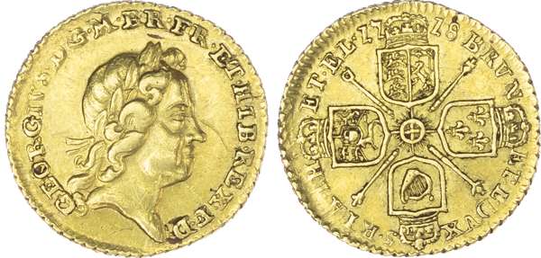 George I (1714-27), Quarter Guinea, 1718, laureate head right, toothed borders both sides legend surrounding GEORGIVS DG MBFE ET HIB REX F.D. Rev, crowned cruciform shields, incorporating the Arms of Hanover, sceptres in angles, garter star at centre, date either side of top crown, BRVN ET L DVX SRIATH ET EL surrounds (S.3638; Bull.550; MCE 277). Toned, few obverse contact marks, otherwise good very fine. Fetching. One of only two years available for this fractional denomination with the other being 1762.