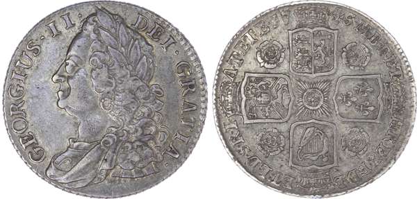 George II (1727-60), Halfcrown, Lima issue, 1745, old laureate bust left, ‘Lima’ below bust, rev, crowned cruciform shields, plain angles, legend surrounds; Shilling, 1745, ‘Roses’ old bust left, rev, crowned shields with roses in angles (S.3695, 3702; Bull. 1687, 1722; ESC.605, 1204). Toned, some contact marks on the halfcrown, otherwise a pleasing duo of the same date. Both good very fine (2).