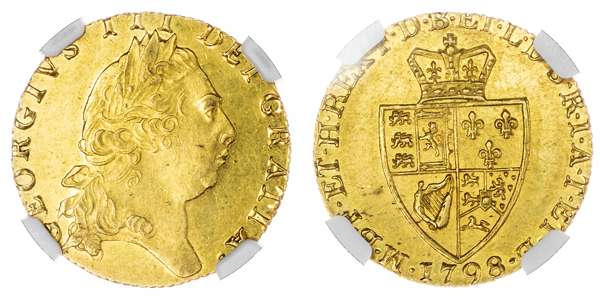 George III (1760‑1820), Guinea, 1798, fifth laureate head right, reads GEORGIVS III DEI GRATIA. Rev, crowned Spade shield,