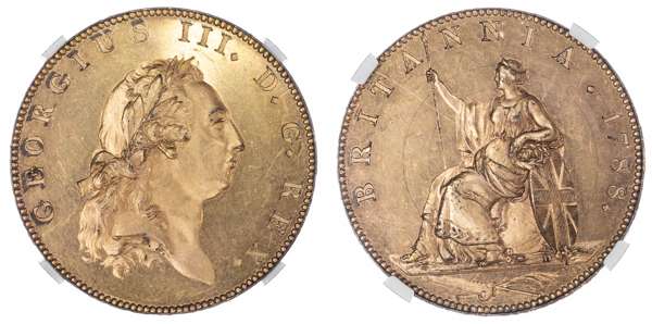 George III (1760‑1820), Pattern Halfpenny, 1788 by Droz, struck in gilt copper, late Soho, laureate head right, reverse struck en medaille, Britannia seated left, edge inverted, RENDER¦TO CESAR ¦ THE THIN¦GS WHICH¦ARE CE¦SARS: followed by two trefoils and flower, (BMC 965, DH11). Encapsulated by NGC as PF62 Cameo.