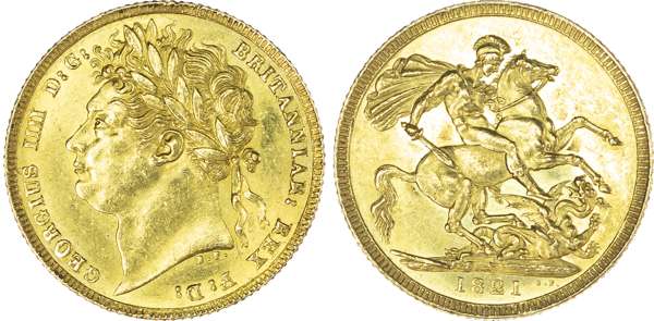 George IV (1820-1827) Sovereign, 1821, laureate head left, reverse St. George and the Dragon (S.3800; Marsh 5). Almost