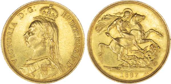 Victoria (1837-1901), Two Pounds, 1887, Jubilee crowned bust left, J.E.B. initials on truncation for Joseph Edgar Boehm, legend surrounding VICTORIA DG BRITT REG FD. Rev, Saint George and dragon right, smaller date and B.P in exergue, (S.3865; Marsh T25). Lustrous toning with subtle red bloom in places, some of the usual contact marks, pleasing detail both sides, good extremely fine.