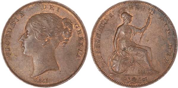 Victoria (1837-1901), Penny, 1855, plain trident, young head left date below, legend surrounds VICTORIA DEI GRATIA, w.w. on