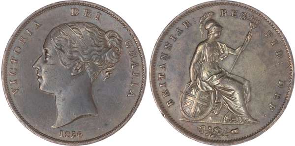 Victoria (1837-1901), Penny, 1856, ornamental trident, young head left date below, legend surrounds VICTORIA DEI GRATIA, w.w. on truncation for William Wyon. Rev, Britannia helmeted seated right with shield and plain trident, emblems in exergue, reads BRITANNIAR REG FID DEF :, far colon (S.3948; BMC.1512: RR). Rich tone with some intermittent lustre, the portrait under closer inspection showing good clarity in the intricacies of the hair and ribbons; some contact marks and nicks, the fields generally clear. Rev, few marks and die breaks in the exergue area. The ornamental trident type is recorded as much rarer than the plain trident for this already rare year. About extremely fine, very rare.