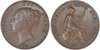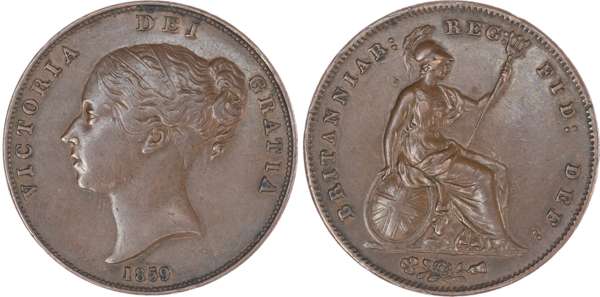 Victoria (1837-1901), Penny, 1859, ornamental trident, young head left date below, legend surrounds VICTORIA DEI GRATIA, no w.w. on truncation. Rev, Britannia helmeted seated right with shield and plain trident, emblems in exergue, reads BRITANNIAR REG FID DEF: (S.3948; BMC.1519). Dark toned with a residual lustre, some contact marks otherwise near or about extremely fine, reflective fields, scarce.