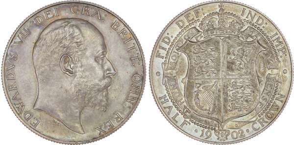 Edward VII (1901‑10), Matt Proof Halfcrown, 1902, bare head right, DES below truncation for engraver George William De Saulles, legend surrounding, EDWARDVS VII DG BRITT OMN REX. Rev, crowned quartered shield of arms, garter motto as inner legend, HONI SOIT QUI MAL Y PENSE, outer upper legend reads FID DEF IND IMP, denomination with date in lower half (S.3980; Bull.3568; ESC.747). Toned, one scratch in W of Edward, otherwise practically as struck.