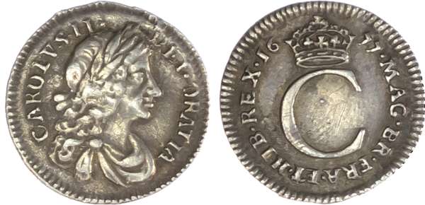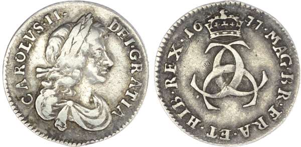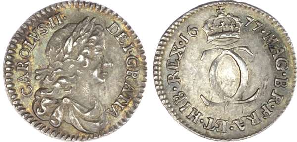 Charles II (1660-85), Maundy Set, 1677, Fourpence, Threepence, Twopence and Penny, laureate and draped bust right, legend surrounds CAROLVS II DEI GRATIA. Rev, value indicated by crowned intertwined C’s, date flanking top crown, the groat with rose, thistle, lis and harp in angles, reads MAG BR FRA ET HIB REX. (S.3392; Bull.600; ESC.2373). Varied state, the Twopence and Penny about very fine, the larger denominations good fine, scarce.
