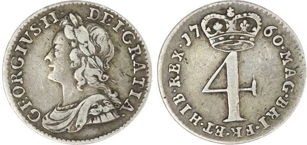 George II (1727-60), Maundy Set, 1760, Fourpence, Threepence, Twopence, Penny, young laureate bust left, toothed border surrounding both sides, GEORGIVS. II. DEI. GRATIA. Rev, crowned mark of value, date either side of crown, legend commences upper right MAG BRI FR ET HIB REX (S.3716; Bull.1774; ESC.2411). Some flatness on the Groat, otherwise very fine, pleasing and rare.
