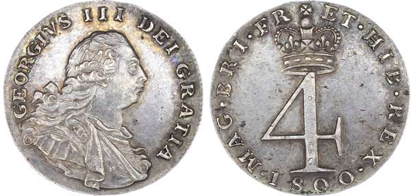 George III (1760-1820), Maundy Set, 1800, Fourpence, Threepence, Twopence and Penny, older laureate and draped bust right, toothed border surrounding both sides, GEORGIVS III DEI GRATIA. Rev, crowned Roman numerals as values, date below, MAG. BRI. FR. ET. HIB. REX. (S.3764; Bull.2239; Dies C/4; ESC.2421). Varied state, the twopence fine, others comprehensive very fine.