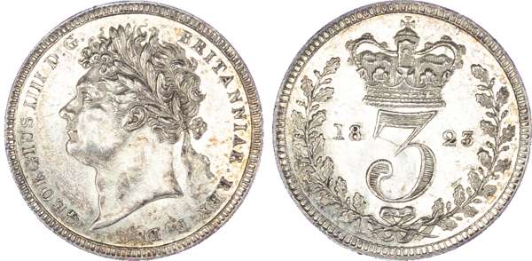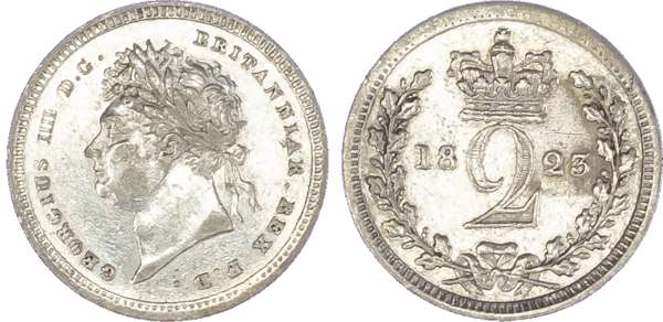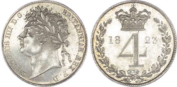 George IV (1820-30), Maundy Set, 1823, Fourpence, Threepence, Twopence, Penny, laureate head left, toothed borders, legend surrounding, GEORGIUS IIII DG BRITANNIAR REX FD. Rev, crowned mark of value, date either side within oak wreath (S.3816; Bull.2446; ESC.2427). Mint bloom with underlying lustre, mottled tone on the 3d. Extremely fine, pleasing.