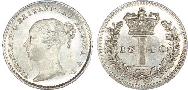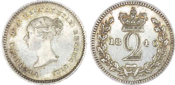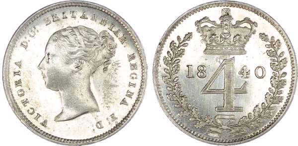 Victoria (1837-1901), Maundy set, 1840, Four, Two and One Pence, young head left, legend and toothed border surrounding, VICTORIA DG BRITANNIAR REGINA FD. Rev, crowned mark of value with date either side contained within oak wreath (S.3916; Bull.3483; ESC.2450). Partial set missing its threepence, otherwise lustrous and sharp, good extremely fine if not uncirculated (3).