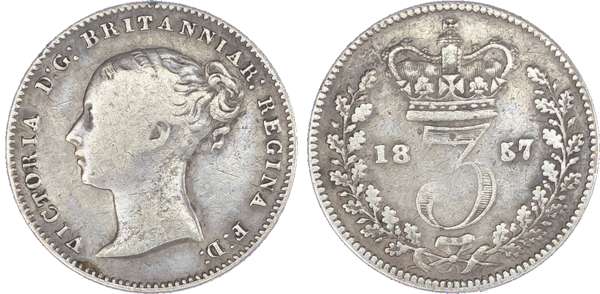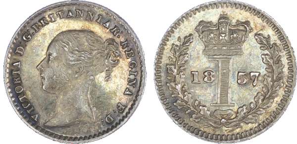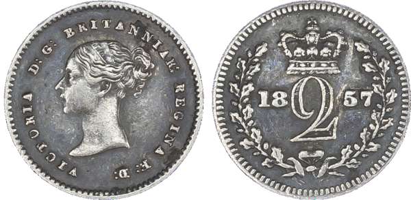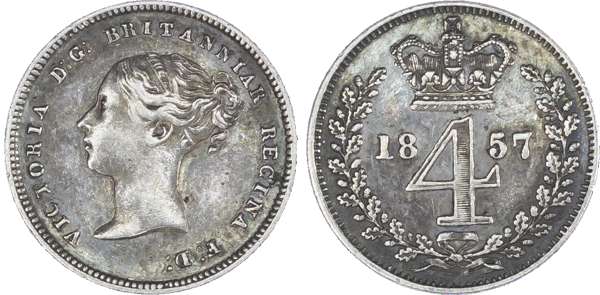 Victoria (1837-1901), Maundy set, 1857, Four, Three, Two and One Pence, young head left, legend and toothed border surrounding, VICTORIA DG BRITANNIAR REGINA FD. Rev, crowned mark of value with date either side contained within oak wreath (S.3916; Bull.3501; ESC.2468). The Penny about fine, others very fine.