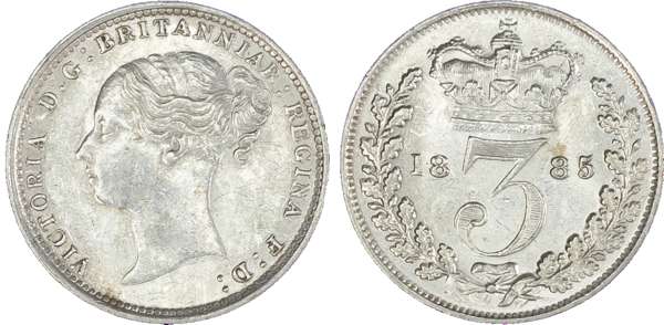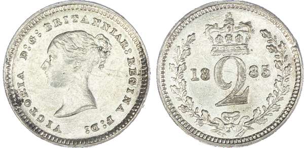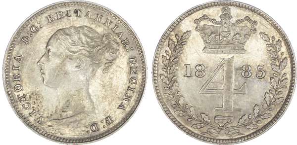 Victoria (1837-1901), Maundy set, 1885, Four, Three, Two and One Pence, young head left, legend and toothed border surrounding, VICTORIA DG BRITANNIAR REGINA FD. Rev, crowned mark of value with date either side contained within oak wreath (S.3916; Bull.3542; ESC.2499). Toned, about uncirculated retaining its mint shimmer.