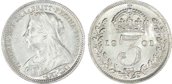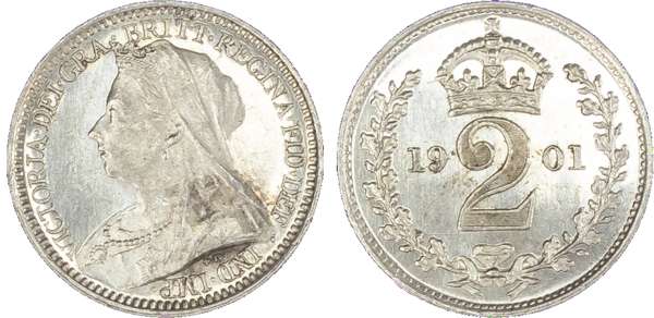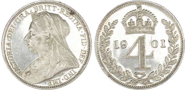Victoria (1837-1901), Maundy set, 1901, Four, Three, Two and One Penny, each with old head bust left, T.B below truncation for designer Thomas Brock, legend and toothed border surrounding, VICTORIA DEI GRA BRITT REGINA FID DEF IND IMP. Rev, crowned mark of value with date either side all within oak wreath (S.3943; Bull.3559; ESC.2516). Extremely fine, toned.
