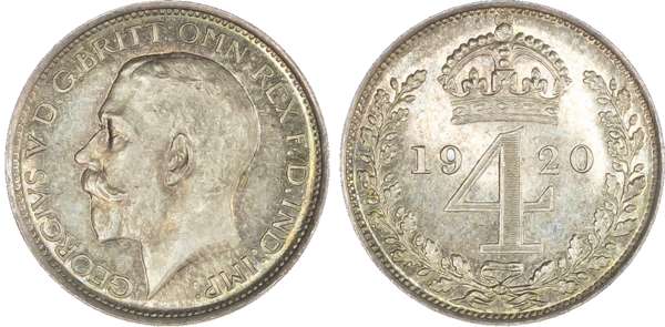 George V (1910‑36), Maundy set, 1920, first coinage [1911‑19], bare head of King left, with raised BM for Bertram Mackennal
