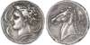 Sicily, Siculo‑Punic, Entella (c. 320/15-300 BC) AR Tetradrachm, 17.27g. Wreathed head of Arethusa facing right, surrounded by four dolphins. Rev. Horse’s head left, palm tree behind, mmhnt (in Punic) below. (Hunterian 9; Jenkins 56). About Extremely Fine. Excellent artistic style. Ex. Spink Numismatic Circular, 2002, lot GK0517 (illustrated on inside front cover); Ex. Talbot Reay Collection, Feuardent, Paris (July 1919) lot #215.