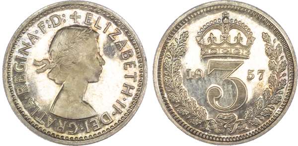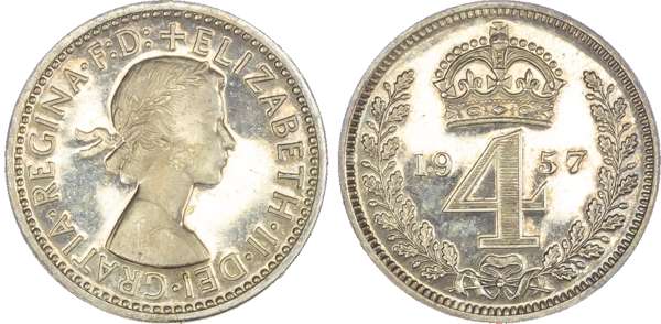 Elizabeth II (1952-2022), Maundy set, 1957, Four, Three, Two and One Pence, each with young laureate head of Queen right, legend and beaded border surrounding, +ELIZABETH.II. DEI. GRATIA. REGINA. F:D. Rev, crowned mark of value with date flanking contained within oak wreath (S.4131; Bull.4567; ESC.2574). Mottled tone, much as struck. This 1957 Maundy service was held at St Alban’s Cathedral, rare.