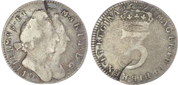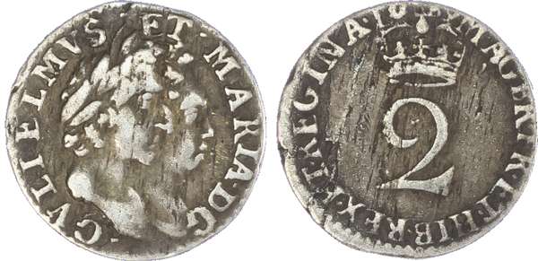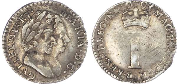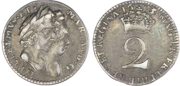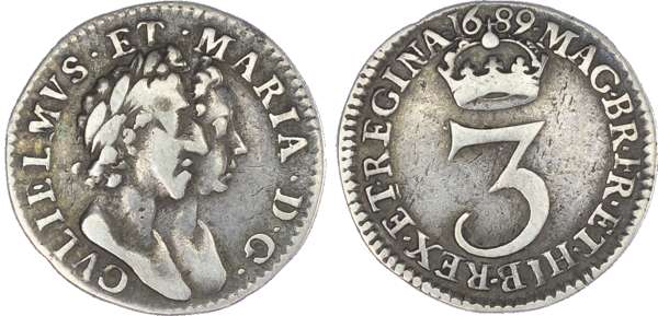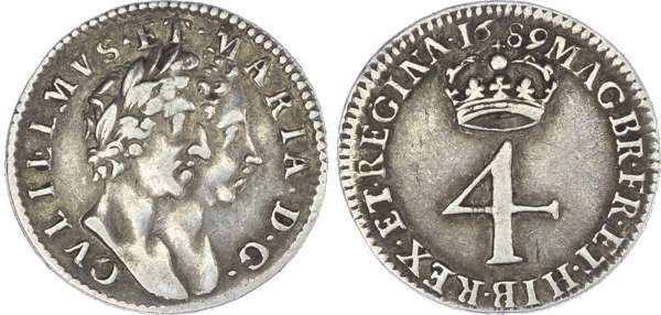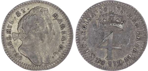 William & Mary (1689-94), Fourpences, 1689, 1693; Threepences, 1689, 1691; Twopences, 1689, 1693/2; Penny, 1693 (S.3439;