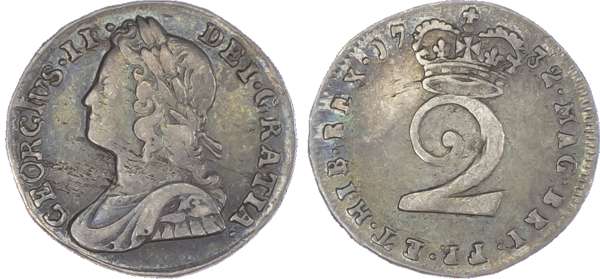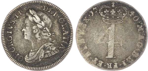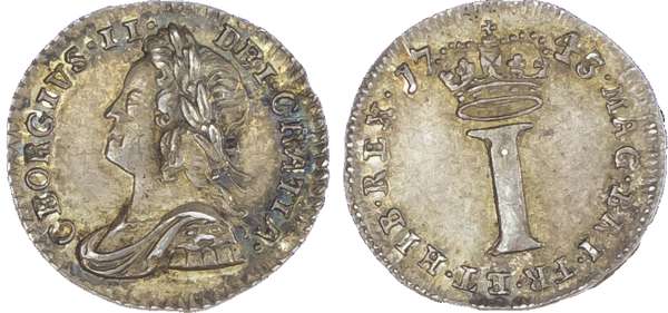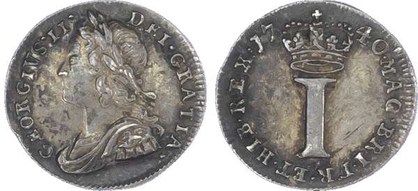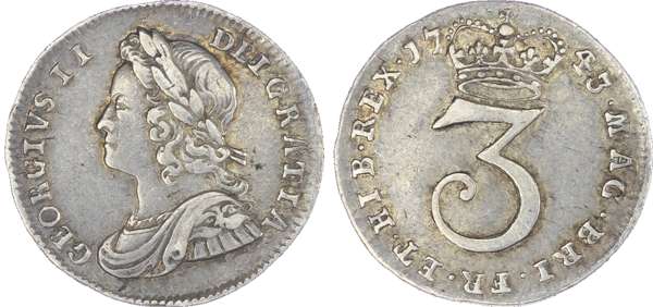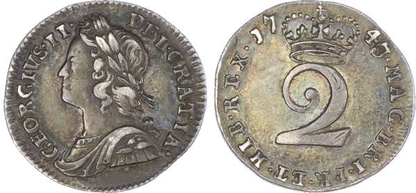 George II (1727‑60), Fourpence, 1740; Threepence, 1743 smaller lettering; Twopences, 1732, 1743/0; Pennies, 1740, 1743