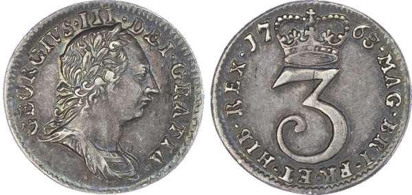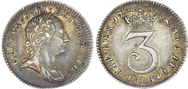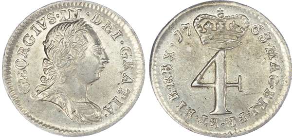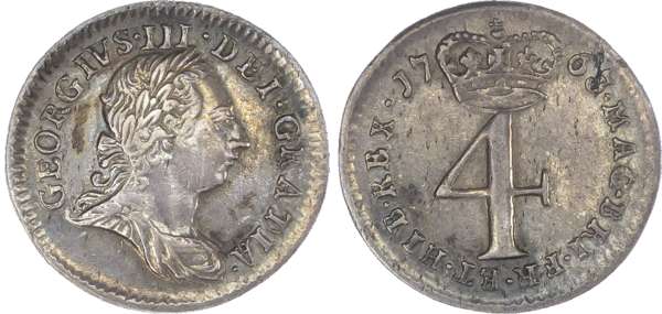 George III (1760‑1820), Young laureate bust, Fourpences, 1763 (2); Threepences, 1762, 1763; Penny, 1763, 1772 (S.3750; 3753; 3759). Bold very fine to extremely fine (6).