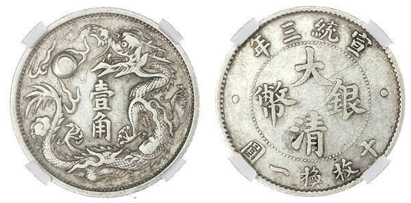China, Qing Dynasty, Hsuan Tung (1908-11), silver 10 Cents, 1911, 3rd year, Tientsin mint (LM 41; K. 230). In NGC holder graded XF Details – Reverse cleaned.