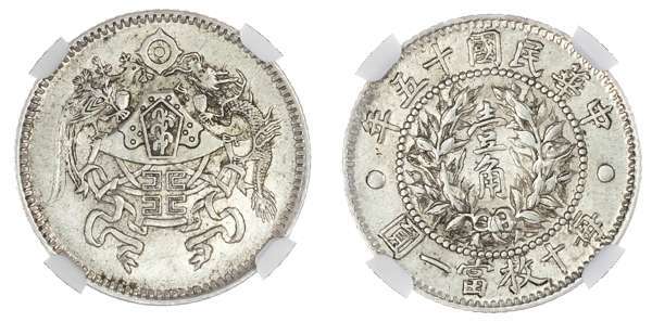 China, Republic, Dragon and Phoenix silver 10 Cents, 1926, year 15, Tientsin mint, dragon and phoenix over symbol of longevity. Rev. Denomination in wreath, 2.74g (LM 83; KM Y-344; K. 682). In NGC holder graded MS 62.