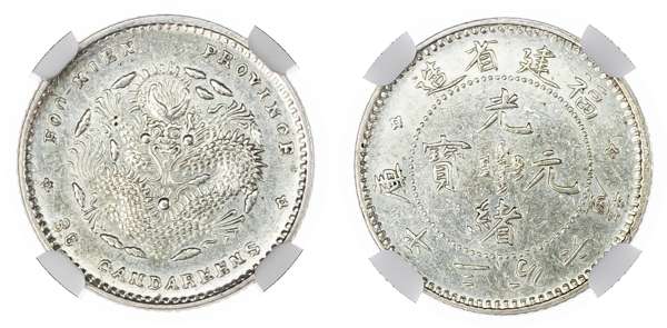 China, Fukien, silver 5 Cents, 1894, Fukien mint, rosette at either side of side view dragon right, 1.35g (LM 294; KM Y-102.1-later issues). In NGC holder graded as MS 61.
