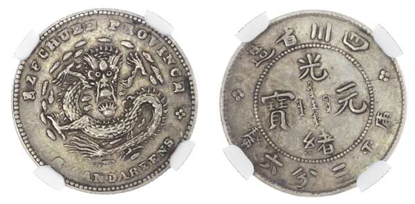 China, Szechuan, silver 5 Cents, ND (1898-1908), ‘8ZECHUEN’ variety, 1.33g (K. 149; LM 351). In NGC holder AU 55.