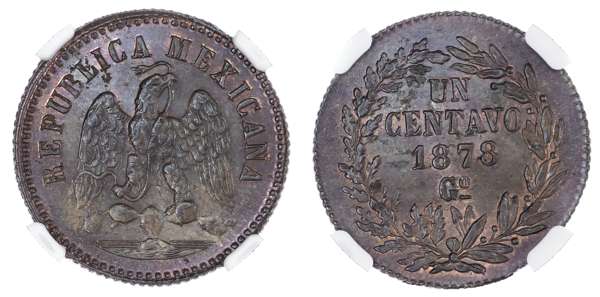 Mexico, Republic, copper Centavo, 1878 Go, Guanajuato mint, 8.10g (KM 391.4). In NGC holder graded MS 64 BN. The finest known example in NGC census, superb lustre.
