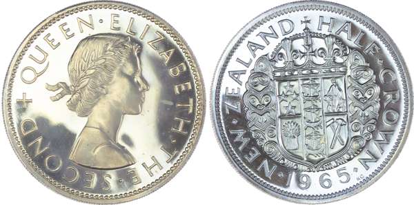 New Zealand, Elizabeth II (1952-2022), Last Pre-Decimal Proof Set (7), 1965, so-called Ballot Sets, including: Half Crown, Florin, Shilling, Sixpence, Threepence, Penny, Halfpenny (KM PLS 2). Uncirculated Proofs in original red plush case. A souvenir set of the last pre-decimal coins from the last minting in 1965 by the Royal Mint, London. Only 500 of these sets were issued. (7)
