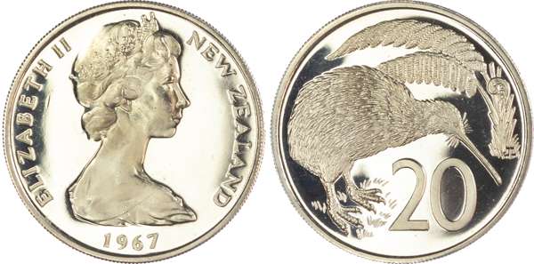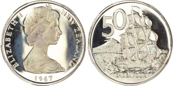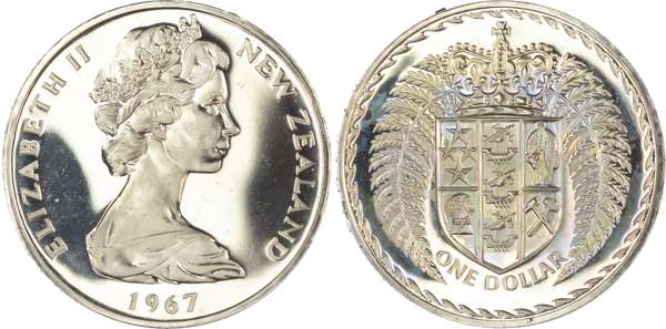 New Zealand, Elizabeth II (1952-2022), First Decimal Proof Set (7), 1967, so-called Ballot Sets, including: Dollar, 50 Cents, 20 Cents, 10 Cents, 5 Cents, 2 Cents, 1 Cent (KM PLS 4). Uncirculated Proofs in original blue plush case. A souvenir set of the decimal coins from the first minting in 1967 by the Royal Mint, London. Only 500 of these sets were issued. (7)
