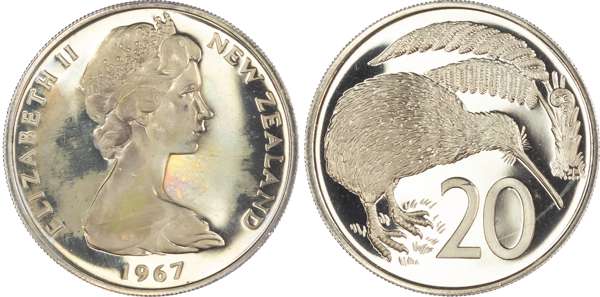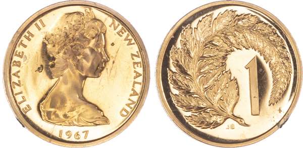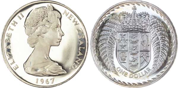 New Zealand, Elizabeth II (1952-2022), First Decimal Proof Set (7), 1967, so-called Ballot Sets, including: Dollar, 50 Cents, 20 Cents, 10 Cents, 5 Cents, 2 Cents, 1 Cent (KM PLS 4). Uncirculated Proofs in original blue plush case. A souvenir set of the decimal coins from the first minting in 1967 by the Royal Mint, London. Only 500 of these sets were issued. (7)