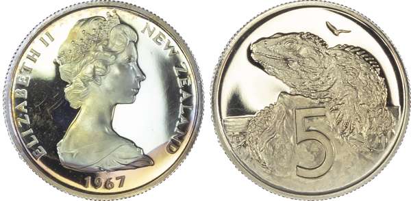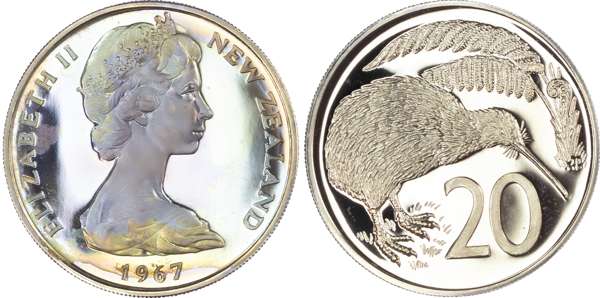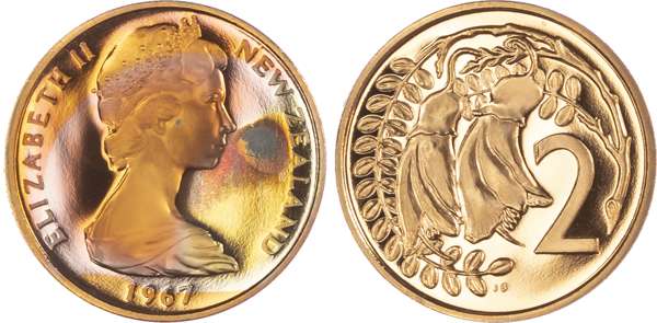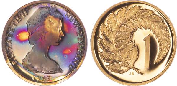 New Zealand, Elizabeth II (1952-2022), First Decimal Proof Set (7), 1967, so-called Ballot Sets, including: Dollar, 50 Cents, 20 Cents, 10 Cents, 5 Cents, 2 Cents, 1 Cent (KM PLS 4). Uncirculated Proofs in original blue plush case. A souvenir set of the decimal coins from the first minting in 1967 by the Royal Mint, London. Only 500 of these sets were issued. (7)