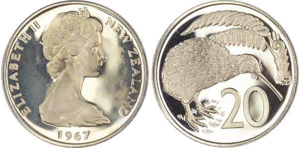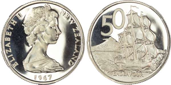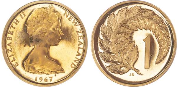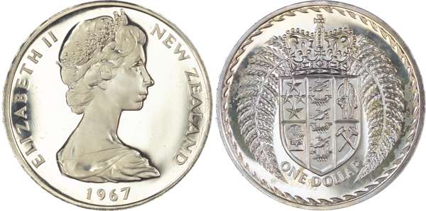 New Zealand, Elizabeth II (1952-2022), First Decimal Proof Set (7), 1967, so-called Ballot Sets, including: Dollar, 50 Cents, 20 Cents, 10 Cents, 5 Cents, 2 Cents, 1 Cent (KM PLS 4). Uncirculated Proofs in original blue plush case. A souvenir set of the decimal coins from the first minting in 1967 by the Royal Mint, London. Only 500 of these sets were issued. (7)