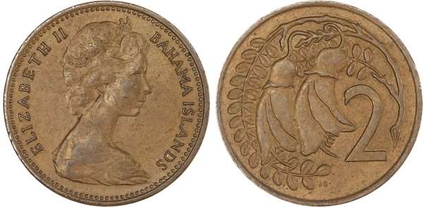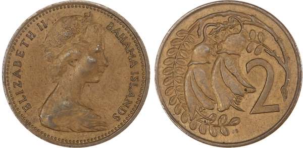 New Zealand, Elizabeth II (1952-2022), mule bronze 2 Cents (2), 1967, mule of Bahamas obverse with reverse of New Zealand (KM 33). Extremely Fine. An interesting type, this error is estimated to have had an mintage of roughly 50,000. (2)