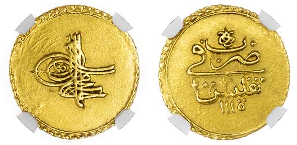 Ottoman Empire, Ahmad III bin Mohammad (AH 1115-1143 / 1703-1730 AD), gold Findik, Tiflis (Tblisi) mint, AH 1115 / 1703 AD, toughra Ottoman Sultan Ahmad III. Rev. Mintmark and date, 3.48g (KM 8; Pere 514). In NGC holder graded AU 55. Extremely rare mint – only a handful examples known on the market, with this being the finest one.