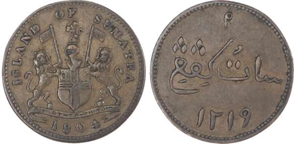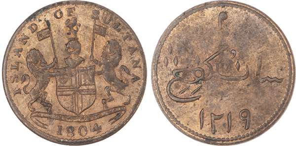 Singapore, copper Merchant Tokens (3), 1804, “Sunatra” error Token, Island of Sultana Token, East India Company Token, 2.09g, 1.83g, 2.04g (Pr. SM A/I-16; Pr. 5; Pr. 21). Very Fine to Extremely Fine. (3)